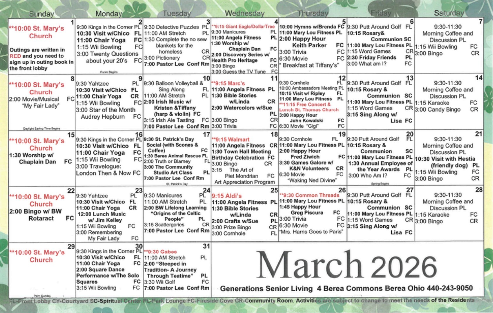 Generations Senior Living of Berea is in the heart of the quaint town of Berea, OH. Big city amenities are within driving distance, while restaurants, salons and shops are just steps away from the front door. Enjoy a walk around beautiful Coe Lake, visit the library or participate in the many social activities throughout the week.